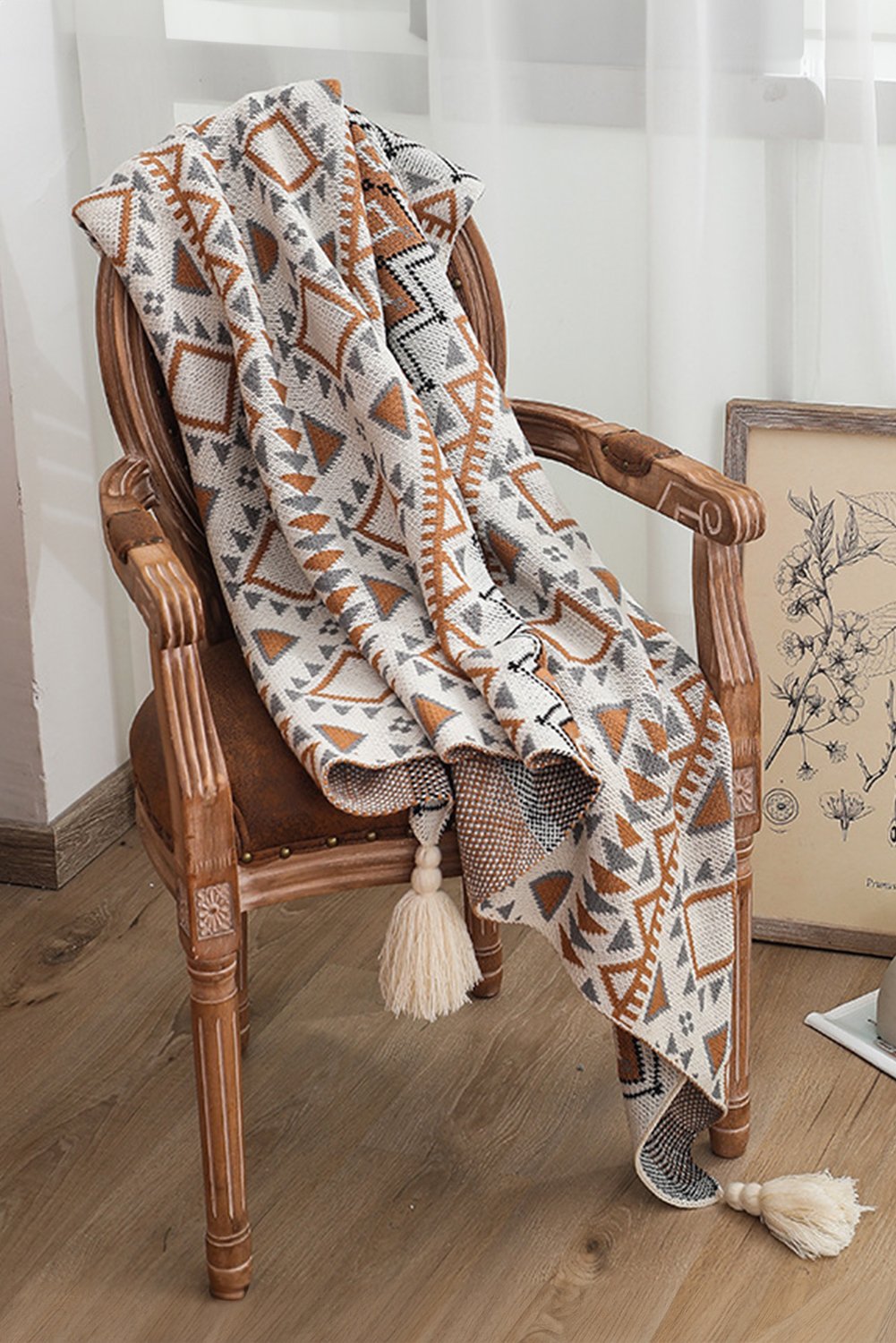 Parchment Geometric Pattern Knit Bohemian Tassel Blanket